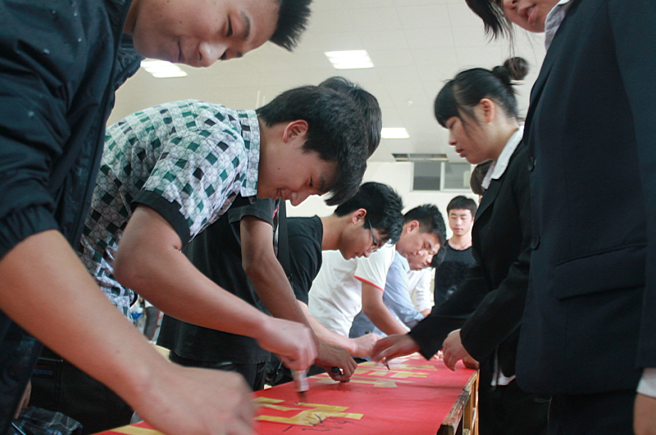 学生们在宣传横幅上签字