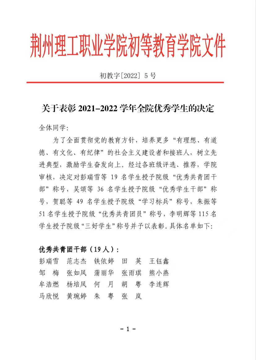 关于表彰2021-2022学年全院优秀学生的决定