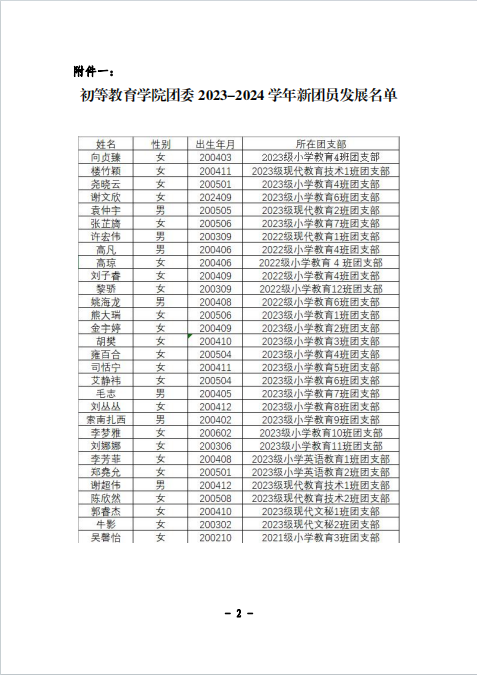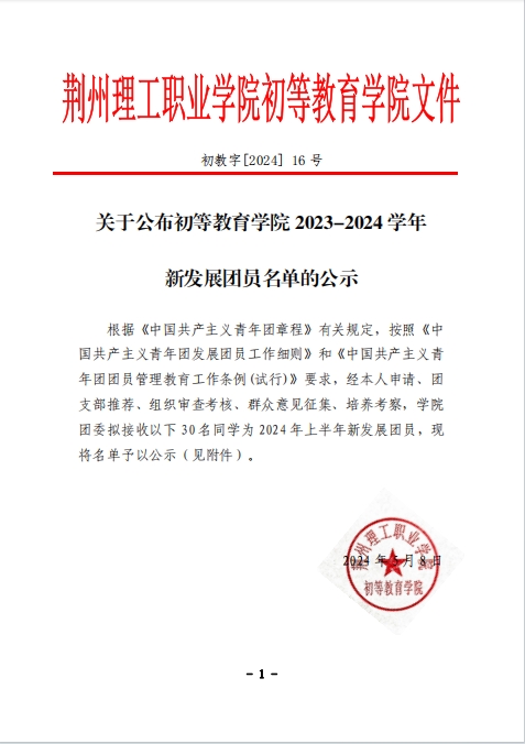 关于公布初等教育学院2023-2024学年新发展团员名单的公示