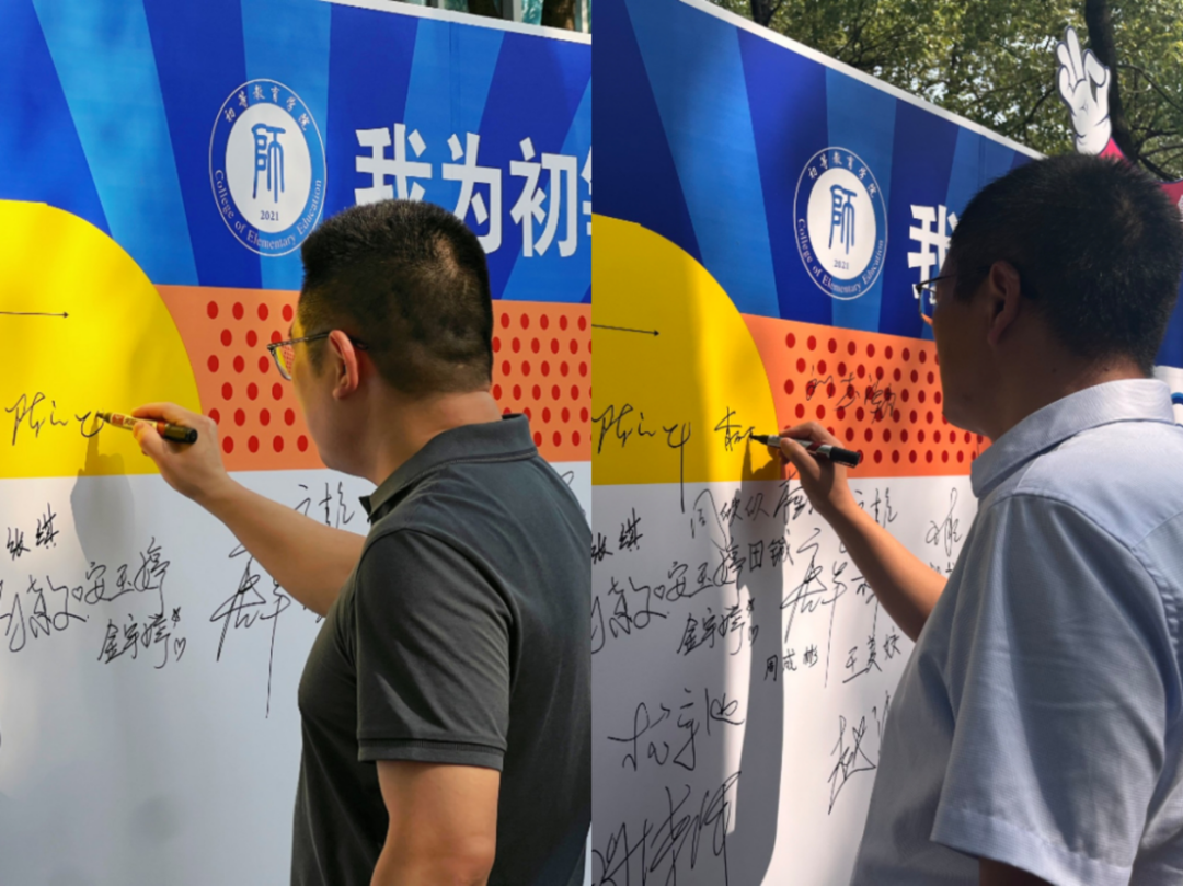 在进行迎新活动的过程中,校党委书记陈庆华、校长肖云林、党委副书记杨章池、纪委书记彭建国、副校长李先武亲临现场,也跟同学们一起参与了本次签名活动。校党委书记陈庆华为现场热烈、蓬勃的气氛所动,他欣喜地表示:"看到同学们满怀热情地参与本次迎新活动,我们深感欣慰,同时我们也相信初等教育学院一定会发展得越来越好。"肖校长在了解了学院各专业的报到情况后,也指出:"不只是传统的小学教育和小学英语教育,今年现代文秘和现代教育技术专业的报到情况也令人欣喜,初等教育学院在各专业的均衡发展方面再进一步!"关怀与激励的话语为迎新活动注入了更多的动力,也让新生们感受到了来自校党委的关爱与支持。我们期待新生们在这样的环境中,迈出坚实的步伐,迎接未来的挑战与机遇。