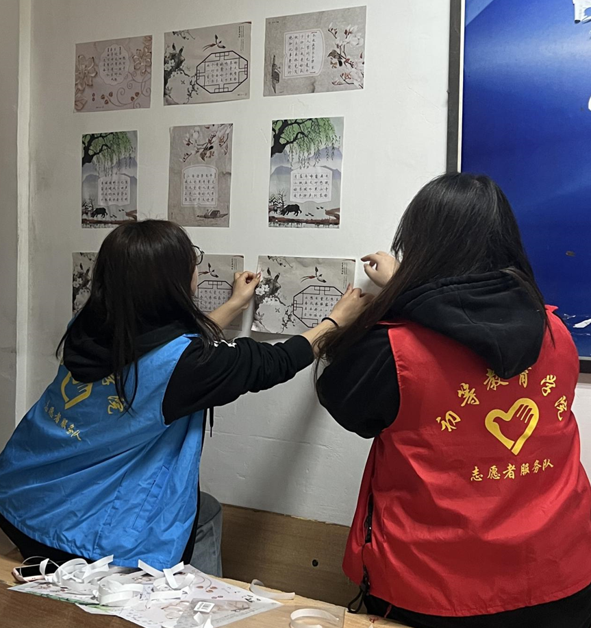 书法创作环节结束之后,学院团学干部帮助同学们张贴优秀作品。