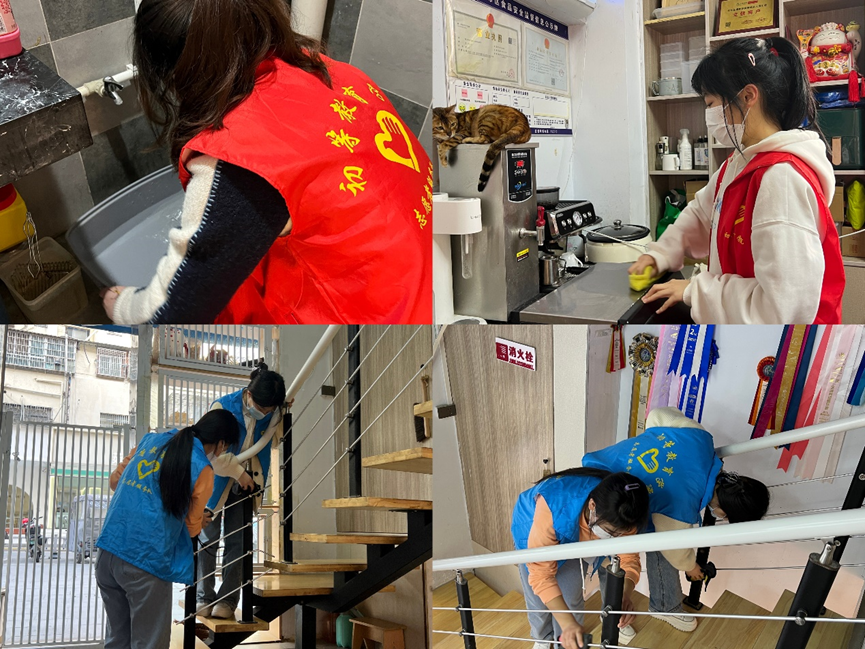 第一组志愿者们默契配合,一人进入笼中认真打扫,另一个人为小猫清理排泄物以及更换食物和水,然后再把它们的笼子全部收纳整齐。