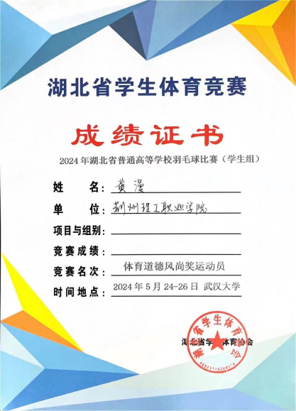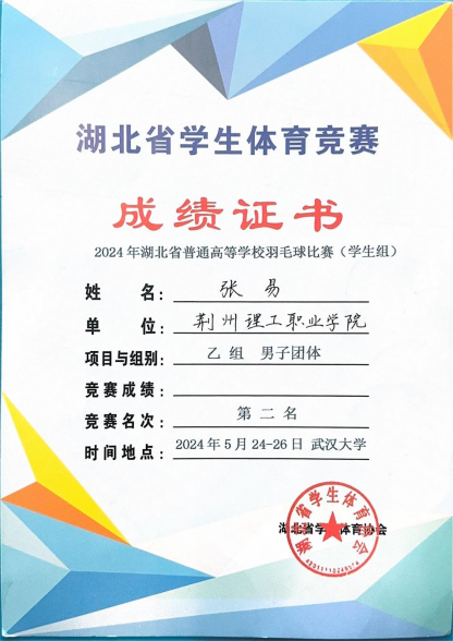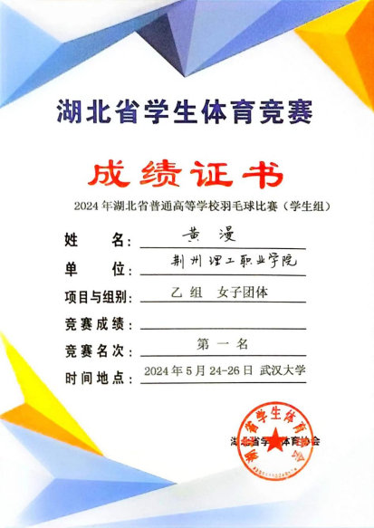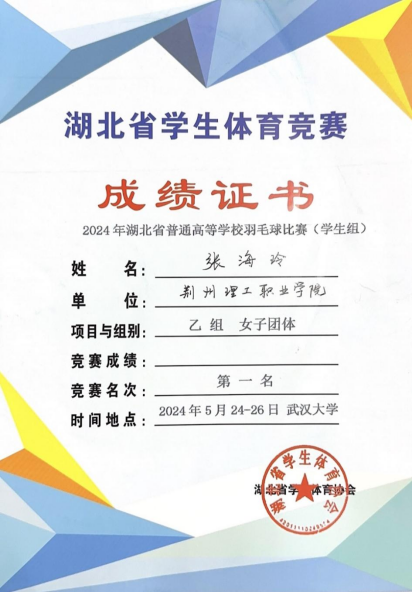 5月26日,2024年湖北省普通高校羽毛球比赛(学生组)在武汉大学圆满收官。我院学子张海玲、张易、黄漫披上战袍随队出征,帮助我校羽毛球队斩获高职高专组女子团体冠军、女双冠军、男子团体亚军的好成绩,实现了我校在此类比赛中的历史性突破!