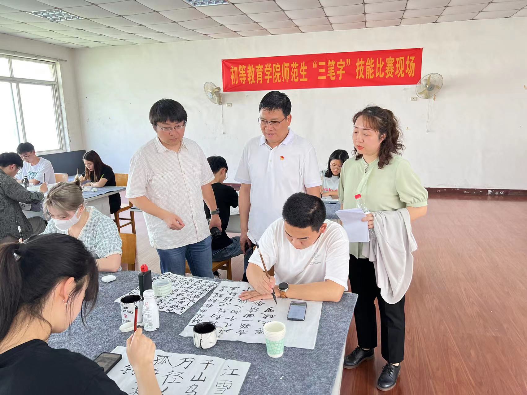 开幕式结束后,各项比赛开始紧锣密鼓地进行。4月26日当天下午举行的是教学技能和"三笔字"比赛,潘校长一行也到比赛现场观摩指导。他们仔细聆听了参赛选手在语、数、英三个学科的现场教学情况,潘校长指出,学生在教学的整体思路上比较清晰,体现出作为师范生的基本职业素养,但在教学的实操细节上还有待打磨和提高。