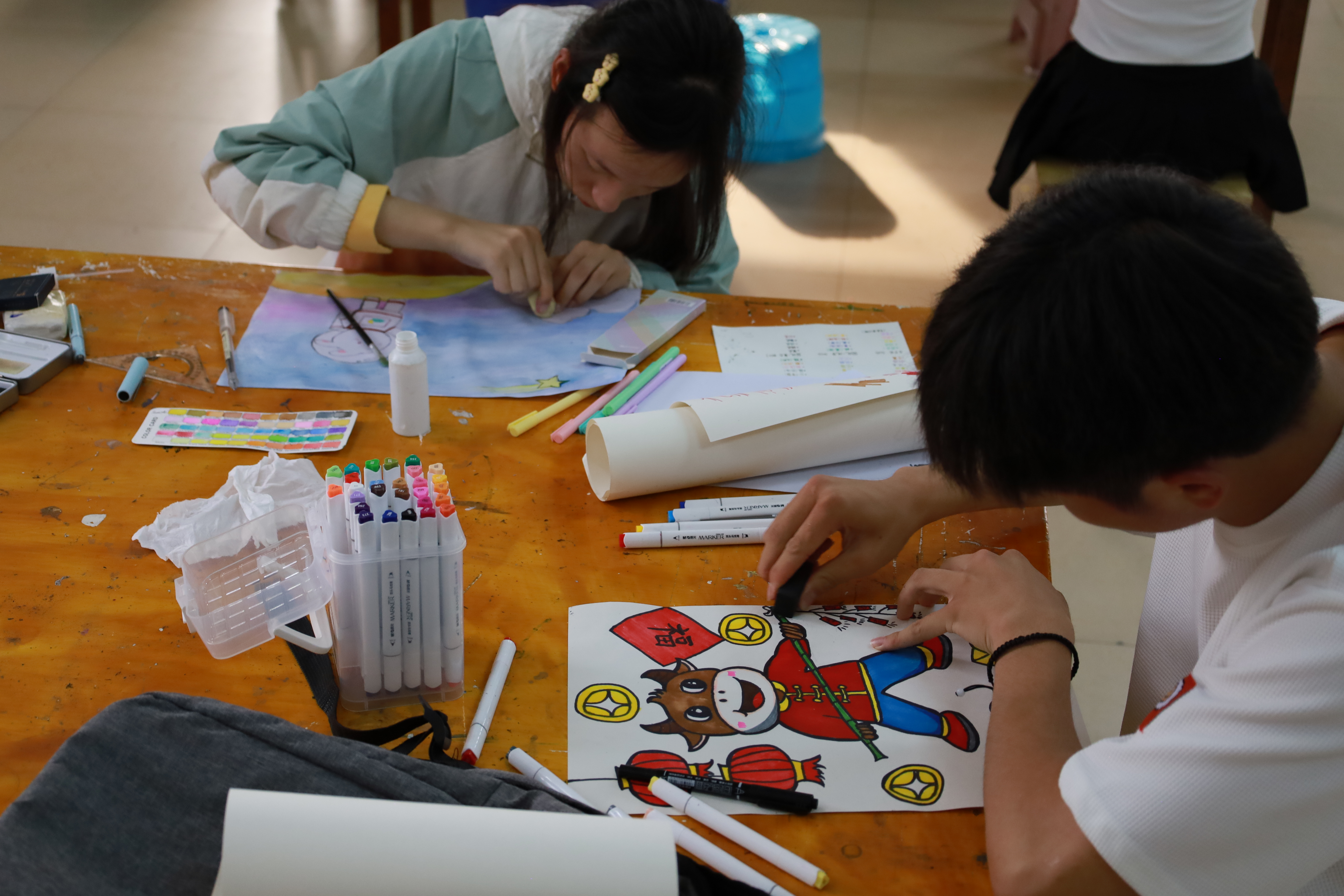 在"三笔字"比赛现场,潘校长一行饶有兴致地观看选手们挥毫泼墨,选手的表现让他们赞赏不已,潘校长同时也指出,同学们的硬笔水平普遍不错,但毛笔水平可能因为平时训练不便,相对弱一点,以后可以加强练习。