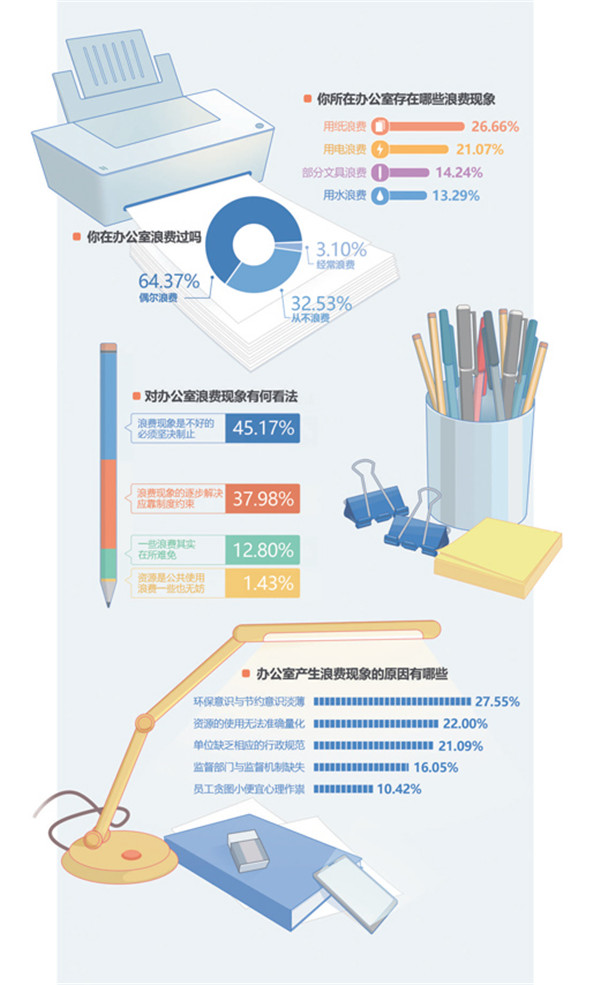 日前,读者来信版与人民网"领导留言板"围绕办公室浪费现象开展问卷调查。办公室浪费现状如何,都集中表现在哪些方面?大家如何看待这个问题及其产生的原因?自己和同事经常浪费吗?针对这些问题,记者展开调查。
