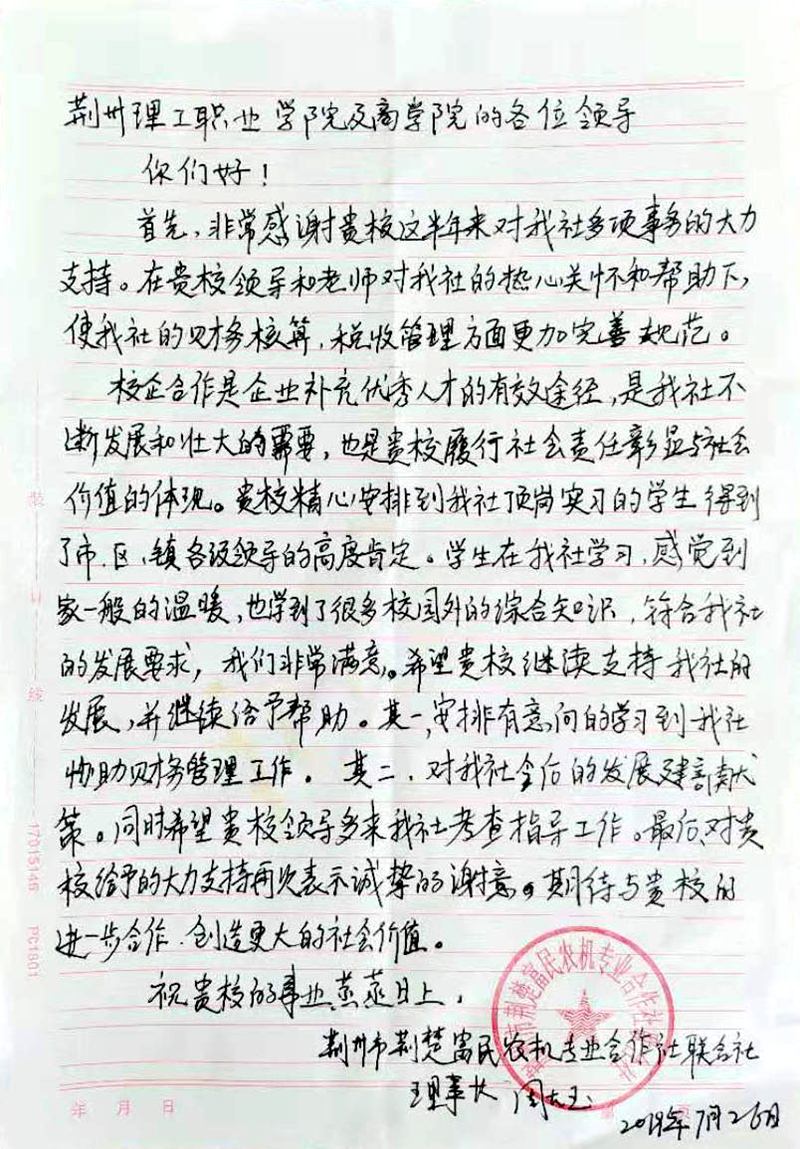 7月26日,荆州市荆楚富民农机专业合作社联合社理事长周大玉专程来到我校,向校领导送上了亲笔书写的致谢信。感谢我校安排商学院学生去合作社顶岗实习,对合作社发展事务给予了大力支持,同时期待与我校建立常态化的深度合作关系。此次校企合作既锻炼了学生的实操能力、综合素质,也使该企业在财务核算、税收管理方面更加规范,同时还为其补充了优秀的人才。我校商学院学子在顶岗实习期间的优异表现得到了市、区、镇各级领导的高度肯定,充分彰显了荆州理工学子的素质和风采。