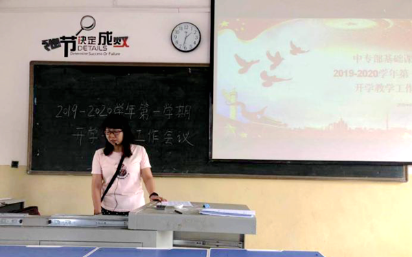钟丽琼副书记代表中专部基础课部领导就新学期教学工作进行了安排部署。她强调,随着学习诊改工作的深入,各位任课教师要认真做好开学教学准备工作,确保开学第一天教学秩序井然。从近三年新进教师到外聘教师,钟书记逐一强调备教辅改各个环节的注意事项,尤其是上课"六必带"的各项具体标准。