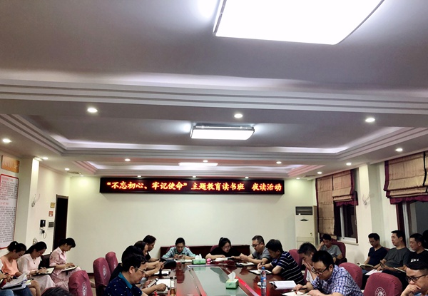为推动"不忘初心、牢记使命"主题教育深入开展,推进理论学习往深里走、往心里走、往实里走,我校开办了"主题教育"读书班,成员由学校领导班子、全体中层干部组成。9月25日晚,第一次"夜读"活动在行政楼四楼大会议室开展,校领导、全体中层干部参加夜读活动。