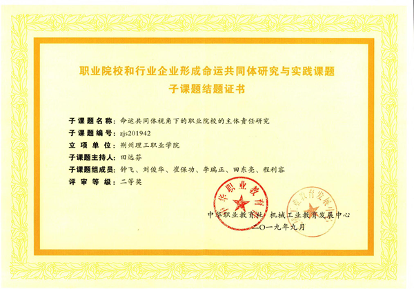 为落实习近平总书记提出的"职业院校和行业企业形成命运共同体"的重要指示精神,9月26日,由中华职业教育社和机械工业教育发展中心联合主办的"职业院校和行业企业形成命运共同体研究与实践课题"结题及交流会在福州成功举办,并获奖子课题进行了表彰。我校副校长田远芬教授主持的子课题"命运共同体视角下职业院校的主体责任研究"成功结题并获二等奖。