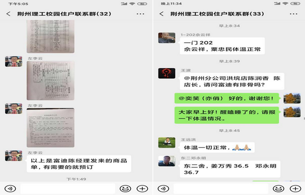 今年春节期间开始的新冠病毒疫情越发把各家各户圈禁在了自家的小范围内了。但是,因为不能随意出入,加上生活物资采买的不便,反而让校内的住户紧紧团结起来了。田远芬副院长、魏新雷、王国亮、刘晓燕等几位老师是雷家垱社区的志愿者,他们在为社区服务的同时,也不忘关心校内住户,帮忙引入了生活物资及药品采购的渠道,洪垸村7组的罗书记等人也热情帮助校内居民解决各种困难。在田校长的关心下,校内居民还成立了临时党支部,党员们主动承担起各项服务工作,总务处长邱敏,逐户敲门,核实校内住户的居住情况和具体人数,把大家都拉进一个微信群,财务处的左李云主动承担起了统计每天生活物资预定情况的工作,我也主动申请统计每天所有校内居民的体温情况,汇总上报所属雷家垱社区。彭海南老师及其家属蒋华也主动到社区报到,参加轮守值班。