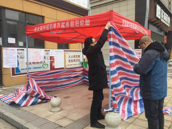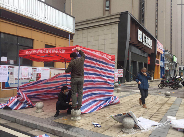 工作组在巡查社区防控工作开展情况时,发现荆襄河片区志愿者值班的棚子四面透风,志愿者们在风雨坚守。工作组组长田远芬副校长当即给学校后勤处打电话,半小时后学校后勤处处长邱敏拉来了帐篷,在工作组成员魏星雷、王国亮的协助下,中午两点多将帐篷四周围拢。