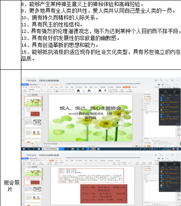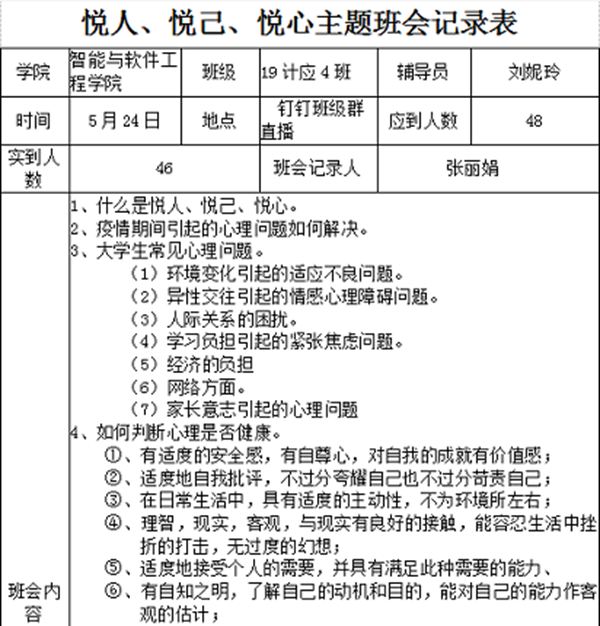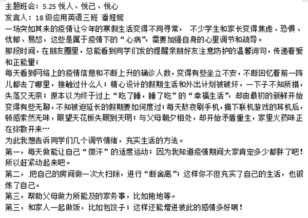 悦,是一种生活态度;悦,源于对生活细微处的每一刻享受;第一重境界在于悦人,第二重境界在悦已,第三重境界在于悦生活。尽管是线上进行主题班会,各班辅导员精心准备,同学们积极参与,内容多种多样,充满了温情、暖心和关怀。摄像头下捕捉了大家各种不同表情的瞬间,虽然我们身处各地,可线上主题班会是我们共同的期待。班会上,辅导员们关注同学的身体健康状况和心理变化,耐心引导同学们正视情绪反应,保持健康积极向上的身心状态,做好必要的防护工作,科学有效抵御新冠肺炎疫情,有些同学也就疫情期间的所见所感,发表了自己的感想。