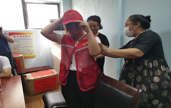 东苑社区党委书记蒋海星、办公室主任程丹及社区工作人员左惟芬、王琳等热情接待了别校长一行人。在社区会议室里,蒋书记向学校各位领导详细介绍了社区的情况。蒋书记说社区工作是上头万把锤,下面一根钉。感谢荆州理工对东苑社区的帮助与支持。肯定了工作组在组长田远芬的带领下,对社区的用心用情的帮扶。工作组组长田远芬给社区书记蒋海星穿上了红马甲,戴上了小红帽。蒋书记说:"这个红马甲、小红帽,代表着荆州理工职业学院对东苑社区及全体下沉社区党员干部的关爱与赤诚之心。这个红马甲很好看,设计人性化。以后学校和社区开展活动的时候正好穿。蒋书记期盼学校和社区以后常来常往,将社区打造成大学生社会实践的基地!