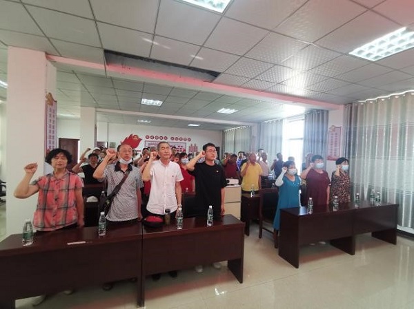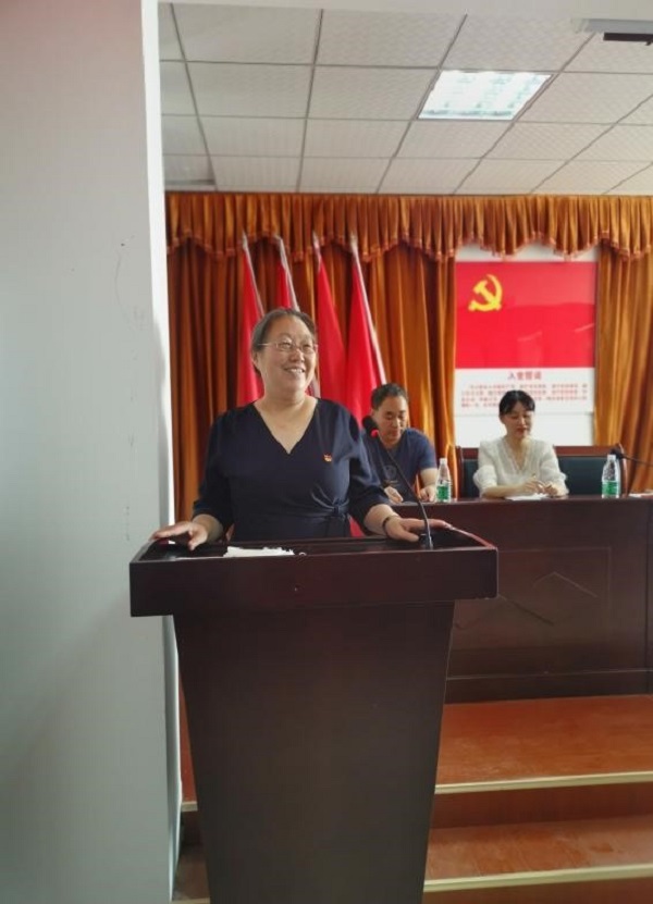 接下来朝阳街道纪工委书记王羽萱同志带领着全体参会党员重温入党誓词,并做了《百年党史中的中国精神》为题的党课,讲了"红船精神"、"抗战精神"以及"抗疫精神"。
