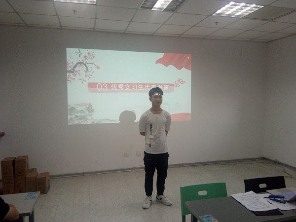 颁奖环节结束后,优秀实习生代表叶瑞超同学发表了获奖感言,他回顾了自己来到天马后的实习经历,分享了实习收获和感想。他表示,提高自己首先要做好自己岗位上的工作,踏踏实实、兢兢业业,不断总结工作经验,从经验中学习,在学习中提高,力争做到刘主任所教导的那样,"宁做凤尾、不做鸡头",一次比一次更优秀,精益求精,做大国工匠。