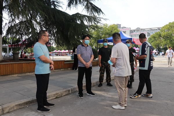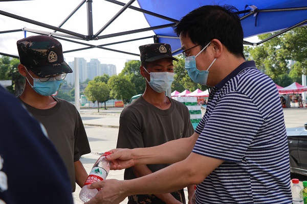 时值初秋,气温依然居高不下。9月4日下午,校长潘贤君,副校长赵康,保卫处任重处长一行先后专程来到我校门口执勤点、校内疫情防控处、财务处、招生办公室等地,看望慰问我校一线执勤志愿者。详细询问志愿者们工作时长、文明劝阻、迎新服务、安全保障等情况,为志愿者们不惧高温、不怕苦累、为学校迎新工作所付出的辛勤劳动表示感谢,嘱咐大家要注意防暑降温,并送来清凉的矿泉水。同时,希望大家按照《荆州理工职业学院2021年迎新工作方案》的要求,高标准、严要求,助力我校2021年迎新工作。