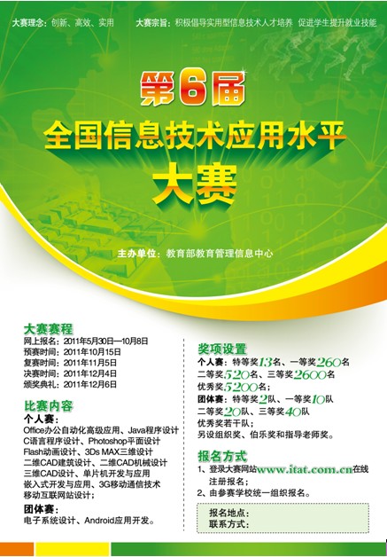 本次大赛吸引了全国各大高校的同学们的积极参与,据统计,全国有322个城市的1165所本、专科院校的152690名大学生参加了本次预赛。比赛项目包括Office办公自动化高级应用、C语言程序设计、Java程序设计、Photoshop平面设计、Flash动画设计、二维CAD建筑设计、二维CAD机械设计、三维CAD设计、单片机开发与应用等13项。赛事旨在提高当代大学生的信息素养与动手能力、提升就业技能,同时为广大的青年学生提供一个展示个人信息技术应用水平的平台。