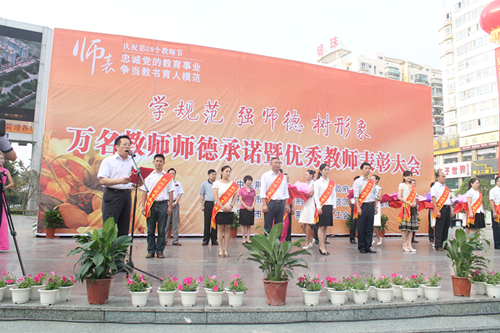 第28个教师节来临之际。荆州市召开学规范、强师德、树形象--万名教师师德承诺暨优秀教师表彰大会,隆重庆祝教师节的到来。