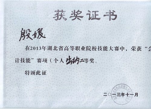 2013年11月9日,首届 "网中网杯" 湖北省高等职业院校会计技能大赛在武汉城市职业学院隆重举行,竞赛由湖北省高等职业教育学会教学委员会主办,全省共有35所高职院校参加。在比赛中,经过紧张激烈角逐,学院经济管理系会计专业2011级学生殷媛在经济管理系副主任胡青华教师的指导下获得会计技能赛项个人二等奖的好成绩。