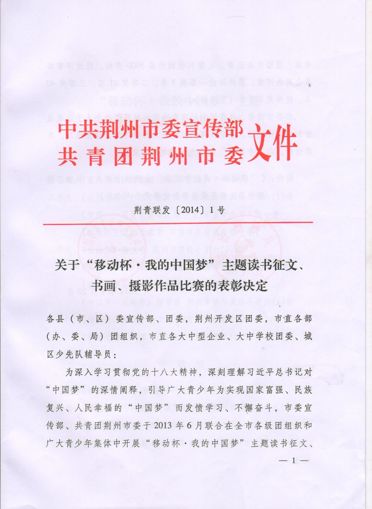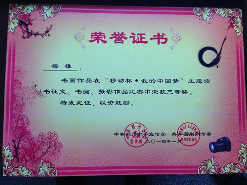为深入学习贯彻党的十八大精神,深刻理解习近平总书记对"中国梦"的深情阐释,引导广大青少年为实现国家富强、民族复兴、人民幸福的"中国梦"而发愤学习、不懈奋斗,市委宣传部、共青团荆州市委于2013年6月在全市各级团组织和广大青少年中开展"移动杯·我的中国梦"主题读书征文、书画、摄影作品比赛,经由我院团委推荐的梅雄同学荣获书画作品三等奖。