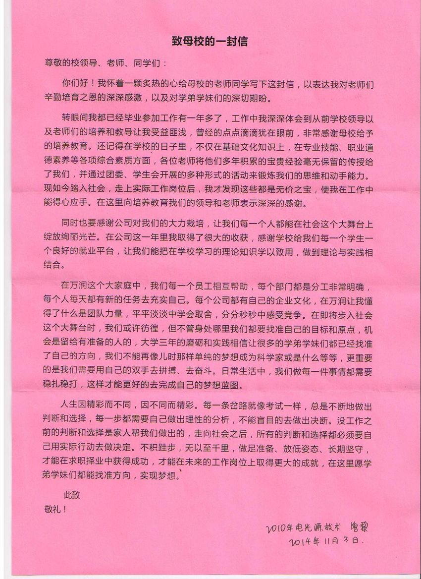 编者按:曾黎,荆州理工职业学院照明与电气工程系2013届电光源专业毕业生,毕业后进入深圳万润科技股份有限公司工作,通过自己一年的努力,成功做到了从一个大学毕业生到一名职业人的身份转化。快乐工作的同时也找到了职业发展的方向。