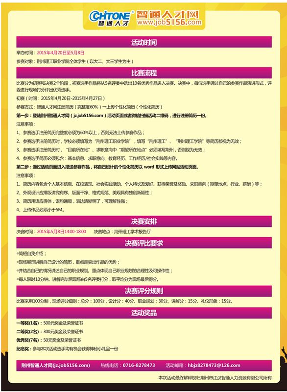 简历是个人履历的精华,也是同学们求职就业的名片,好的简历是同学们能顺利就业并获得理想职业的重要基础。在即将毕业实习之际,为同学们创造机会,规范制作自己的简历并得到专业老师的指导,对同学们求职就业具有重要意义。学院联合智通人才网,通过举办简历设计大赛的方式互通有无、相互促进,为学院2015届毕业生就业工作的顺利开展做好铺垫。