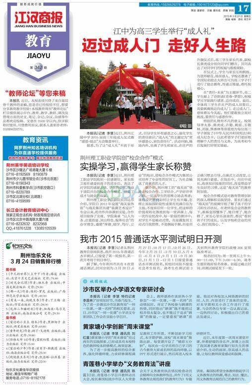 我院校企合作海天班的报道"荆州理工学生家长致海天校企的一封信"被江汉商报报道。