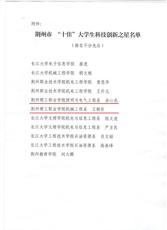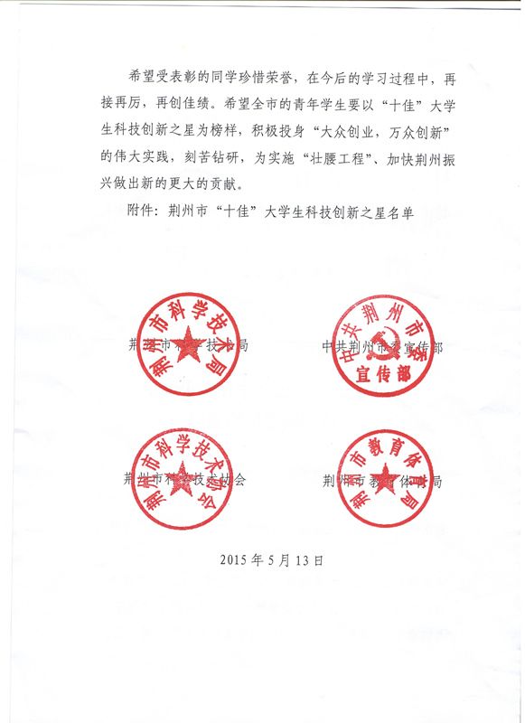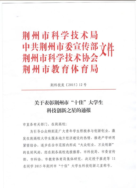 我院学子荣获荆州市"十佳"大学生科技创新之星荣誉