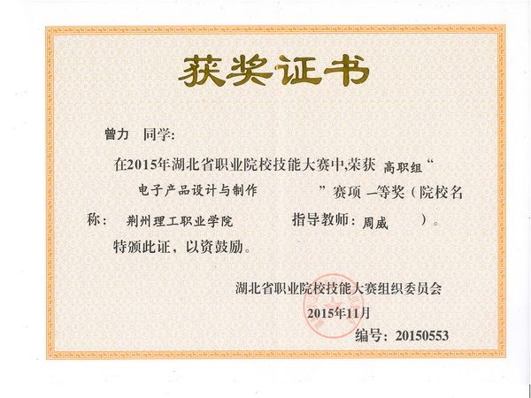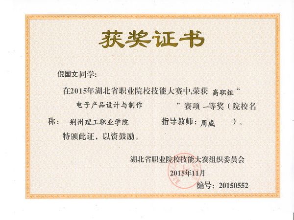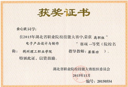 2015年湖北省高等职业院校技能大赛于11月21-22日在武汉船舶职业技术学院举行,由学院照明与电气工程系电子创新实验室倪国文、曾力、余心武3名同学组成的荆州理工职业学院代表队参加了"电子产品设计与制作"赛项,并在竞赛中斩获省一等奖的好成绩。