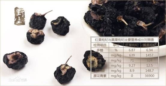黑枸杞,也称黑果枸杞,是最近几年比较火热的产品,市场价格很高。在中国甘肃酒泉、青海东部、新疆中部、内蒙古西部、宁夏和西藏等地皆有零星分布。它生长在人类无法生存的荒山野岭、河床沙滩,拥有着极强的生命力。但随着人类对大自然的开发,黑果枸杞的生存空间愈来愈少,造就了黑果枸杞这一珍稀珍贵的原生态高档滋补佳品内含丰富的花青素、氨基酸和微量元素。其花青素含量是蓝莓的20倍、维生素C的40倍,被称为"花青素之王"。其维生素、矿物质等营养成分含量也很丰富,尤其含具有清除自由基、抗氧化功能的天然的花色甙素,其药用、保健价值远远高于普通红枸杞,被誉为"软黄金"。