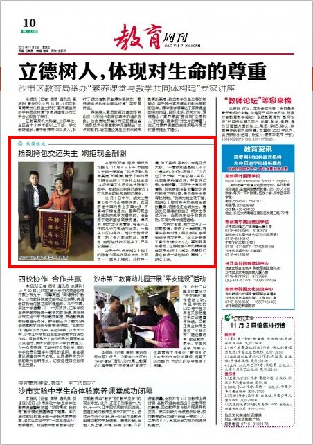 [江汉商报]以“捡到挎包交还失主 婉拒现金酬谢”为题报道我院学子拾金不昧
