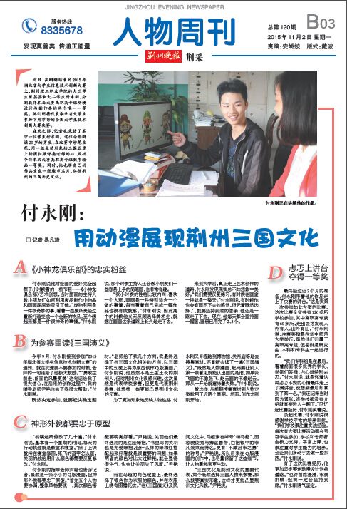 [荆州晚报]整版报道我院学子付永刚——用动漫展现荆州三国文化