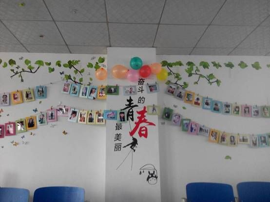 答:以青春为主题,诠释团队合作的概念。充分地体现我们是一个坚不可摧的团队!从某种意义上讲就又回到了上一个问题,因为我们是一家人!在教室的后墙上挂着每个同学的个人照片,通过照片我们能看到一个个可爱青春的身影。这样的布置一方面是方便同学之间彼此认识,另一方面是体现出班集体的团结,这样一个大班级有着这么多人,让每一个人都有自己不是一个人而是有很多人陪着自己走过大学生活的感觉。