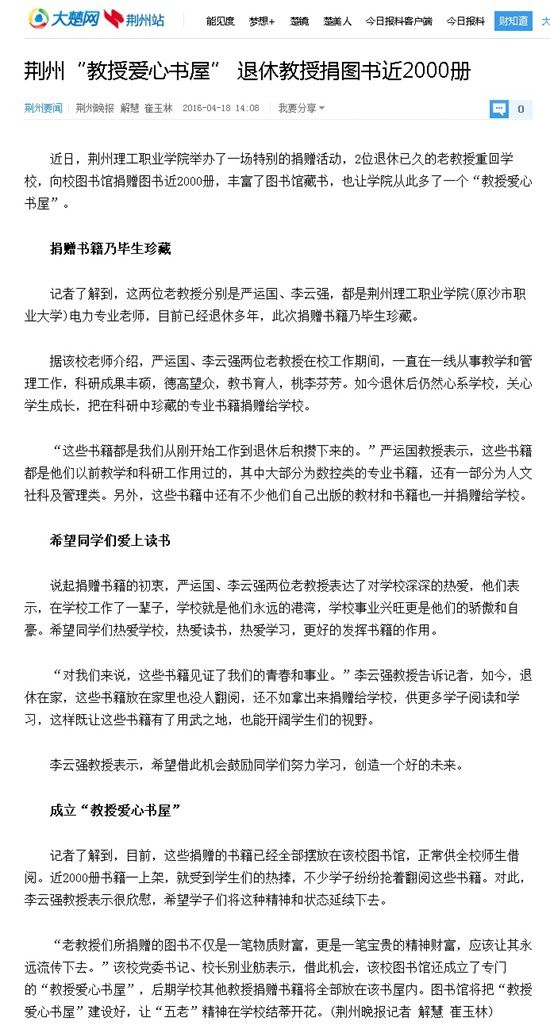 腾讯新闻网4月18日以"荆州‘教授爱心书屋’ 退休教授捐图书近2000册"为标题,对我校两位退休教授(严运国、李云强),向我校图书馆捐赠近2000册图书作了详细报道。