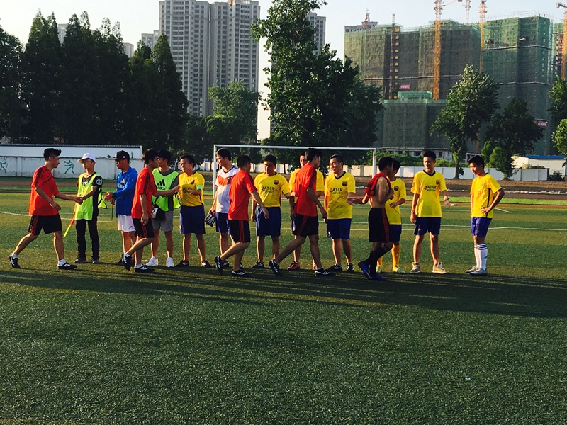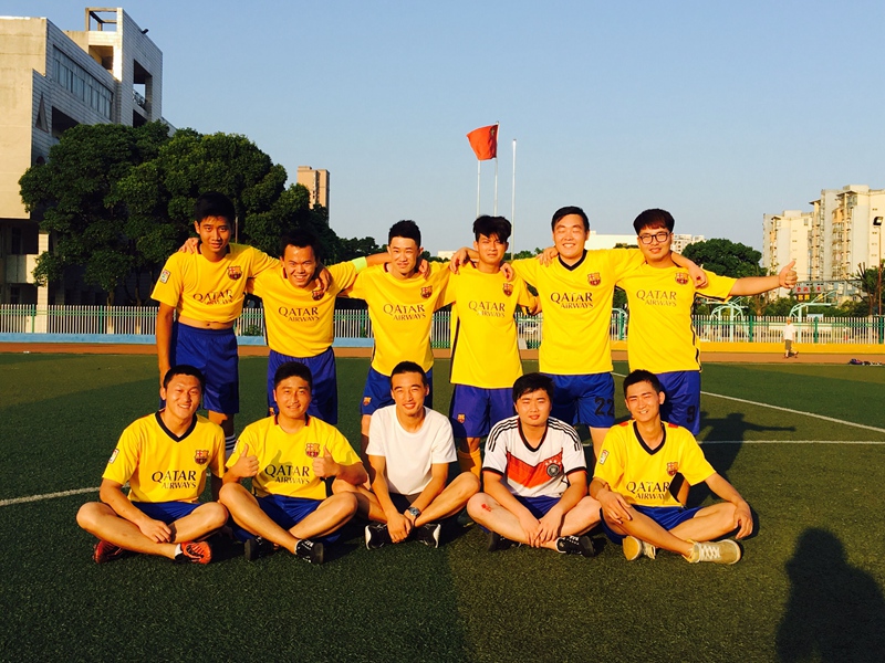 随着裁判的一声哨响,两支球队展开了激烈的角逐。商学院凭借巧妙的攻略,熟练的脚法,默契的配合,多次突破人文与艺术学院足球人员的防线,破门得分。上半场以1:1的分数俩队握手言和。中场休息后,商学院进行人员调配及战术调整,比赛进入下半场的激烈酣战。场上身着黄色球服的商学院队员们激情澎湃,场下观众席上商学院啦啦队为商学院队员们呐喊助威。一度人文与艺术学院的加强防守策略效果显著,使商学院队难以攻破防线,但商学院队员坚持不懈,顽强拼搏,越战越勇,冲破防线又进2球……最后比分以3:2的成绩获得本次足球赛第三名的好成绩。商学院队长牵头带领队员向对方队员、向裁判、向观众席的拉拉队致谢。