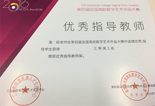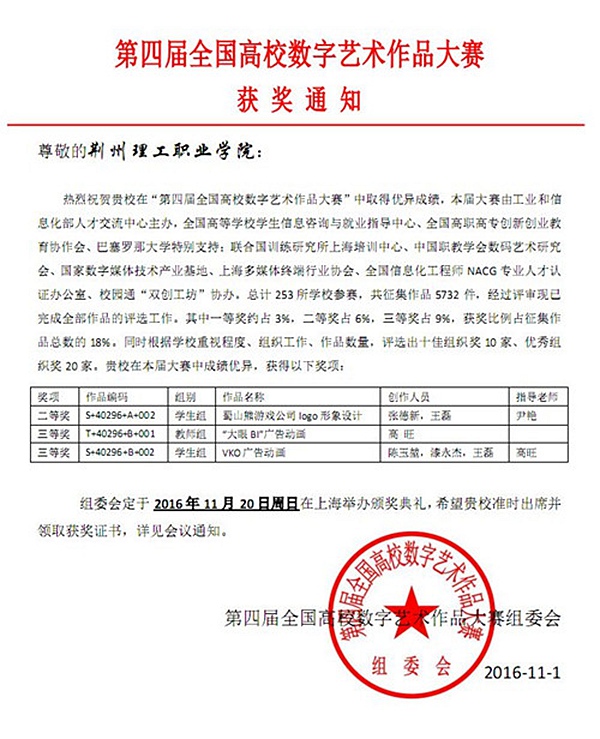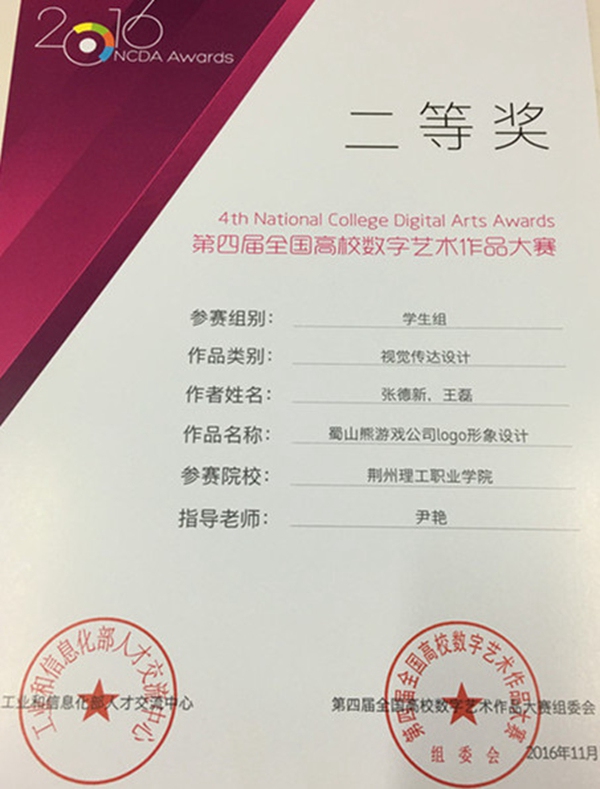 我校师生在"第四届全国高校数字艺术作品大赛"取得优异成绩。尹燕老师指导的《蜀山熊游戏公司logo形象设计》作品在学生组中荣获本届大赛的二等奖,高旺老师指导的《VKO广告动画》作品在学生组中荣获本届大赛的三等奖,同时,高旺老师的《"大眼BI"广告动画》作品在教师组中荣获本届大赛的三等奖。
