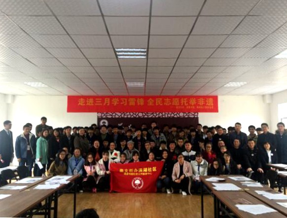 为弘扬社会主义核心价值观,争做雷锋精神传人,为了进一步落实《荆州理工职业学院2016年教学工作要点》的相关精神,不断提升课堂教学质量,在毛泽东思想和中国特色社会主义理论体系概论课程的教师田远芬的带领下,于3月5日上午,智能与软件工程学院2016级计算机应用8班及9班全体师生到滨湖社区清源书院,参与"走进三月 学习雷锋 全民志愿 托举非遗"活动。在刘萍老师的介绍下,让同学们认识了非遗文化,加深了对祖国非遗文化的热爱。