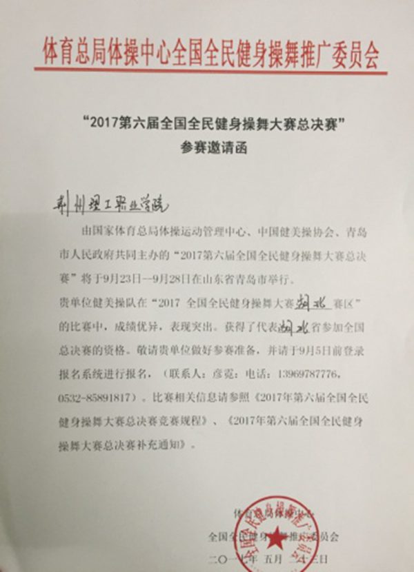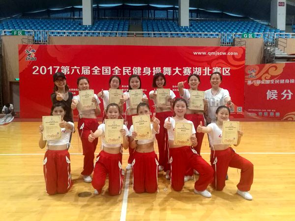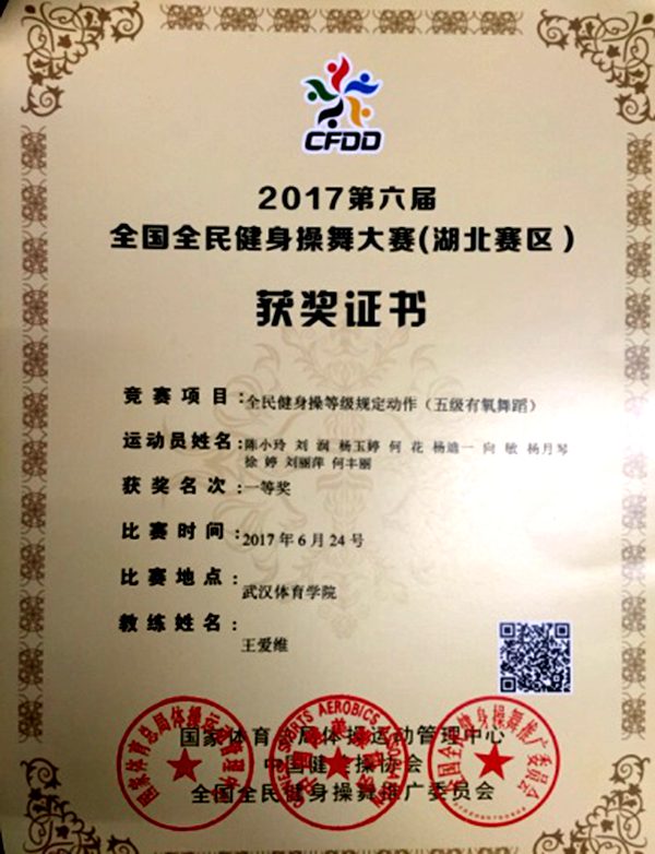 2017年6月24日,第六届全国全民健身操舞大赛(湖北赛区)的比赛落下帷幕,我校健美操队喜获一等奖第一名的好成绩。