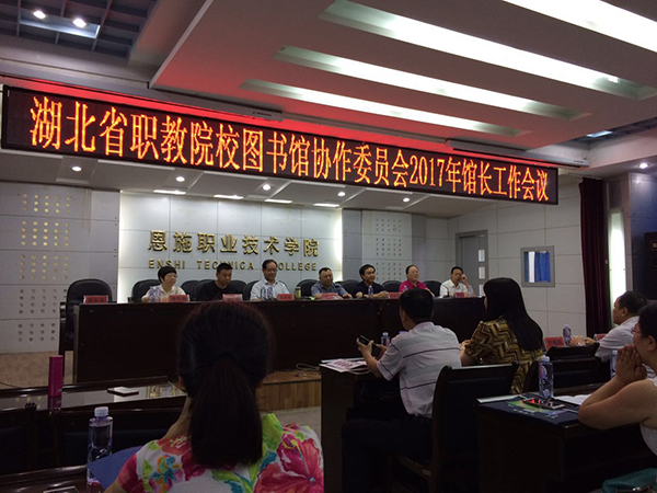 2017年7月13日至14日,湖北省职教院校图书馆协作委员会2017年馆长工作会议在恩施职业技术学院召开,荆州理工职业学院分管副校长田远芬、图书馆馆长唐晓玲、副馆长郭本华三位同志代表学校参加了会议。会议就本年度全省职业院校图书馆工作进行总结,对下一年度工件进行部署,湖北民族学院等10院校做了经验交流。此外,会议还邀请了中国索引学会副理事长、研究馆员、超星集团副总经理中艳鸣教授做了"新媒体、新技术、新服务与图书馆工作创新"学术报告,同方知网职教职培事业部部经理匡惠华和产品总监贾红颖分别做了"新一代研学型数字图书馆建设及应用"和"职业院校图书馆嵌入式服务模式与实践"学术报告。