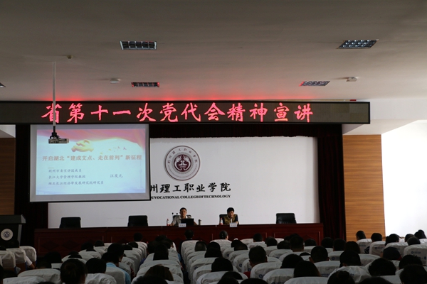 党委书记、校长别业舫表示,我校将以湖北省第十一次党代会为契机,深入宣传和贯彻党代会精神,坚定立场、把握要点,推动学习,落实举措,促进党代会精神深入人心。希望通过宣讲,引导全校党员、教师把思想和行动统一到党代会精神上来,在思想上政治上行动上与省委、市委、学校党委保持高度一致,希望大家结合学校工作实际,回应广大师生关切,更加扎实的把上级和学校的各项决策部署落到实处。学校下一步要继续推动立德树人根本任务落实落地,为迎接党的十九大胜利召开作出更大的贡献。
