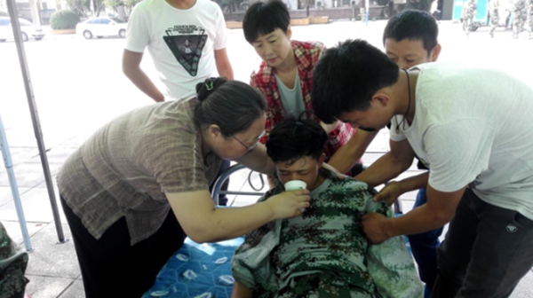 9月7日,副院长田远芬教授来到军训医疗点,亲自照顾从军训场上倒下的新生。