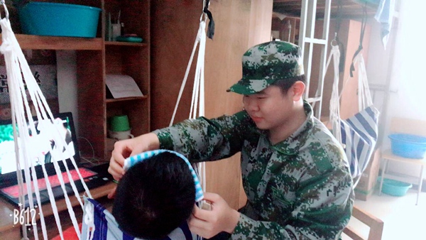 在9月9号的训练中,兰梓豪同学突然倒下了,几名同学把他抬到商学院大本营,他虚弱的声音,告诉我们他脚里面的钢片异位,磨穿了他的皮肤。他头上大颗的汗珠往下滴,从额头留到脖子,一起汇聚到那身迷彩军装里面。兰梓豪拒绝了我和学长们陪同他去医院,他说这点小伤他可以自己处理好,他在地上躺了五分钟,然后手撑着地慢慢站起来,一瘸一拐的走向教官,"报告教官,去医院取钢片",兰梓豪敬了个礼,得到教官允许后,径直走向我这边,"老师,我有个室友叫李浩的,最近发烧,在病号里面,我可以带他去医院。不需要老师和学长带。",就这样一瘸一拐的兰梓豪,搀扶着李浩,去到了二医。在当天晚上,李浩突然高烧不退,兰梓豪不顾脚上的伤,和张华学长等人毅然扛起了李浩,再次奔向医院、、、、、、