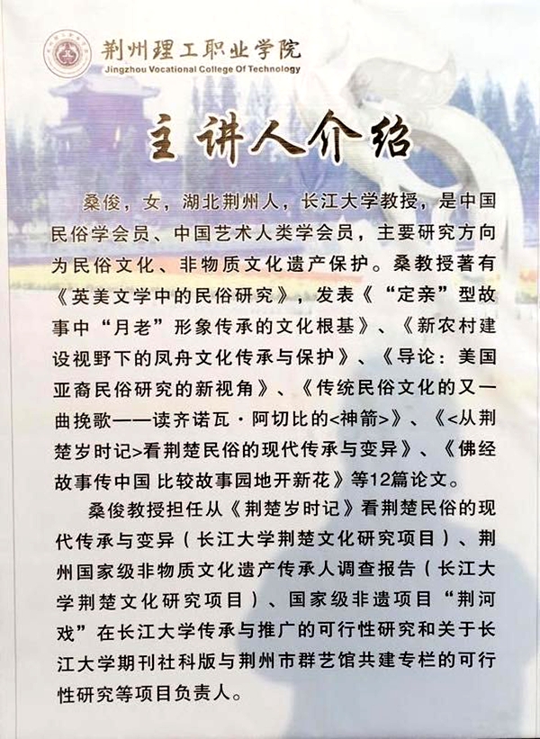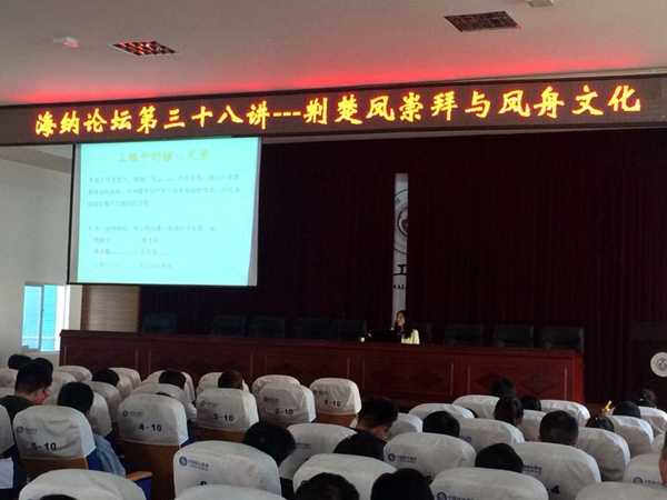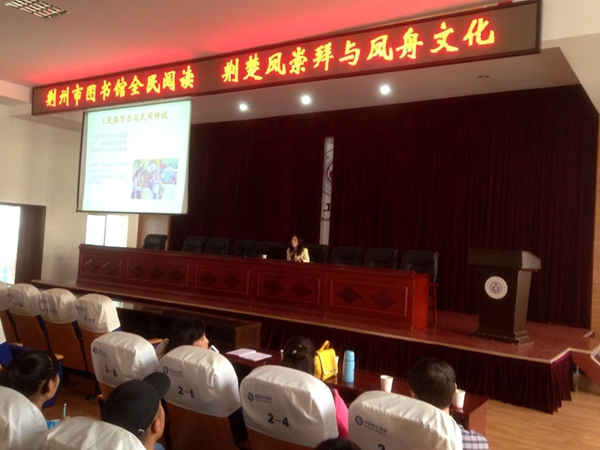 10月24日下午3时,由学工处和图书馆联合主办的第38期海纳论坛——非物质文化遗产之荆楚凤崇拜与凤舟文化在荆州理工职业学院学术报告厅隆重开讲。本次讲座作为荆州市图书馆"全民阅读"活动的一部分,特地邀请到了来自长江大学,长期从事民俗文化和非物质文化遗产保护研究工作的桑俊博士。她绘声绘色地向同学们介绍了当下保护非物质文化遗产的重迫切性,带大家了解了以端午节习俗为文化载体的荆楚凤文化,更呼吁同学们热爱地方文化并传承传统文化。在长达八十分钟的讲座中,同学们充分感受到了独特的荆楚地域文化和中华大地上源远流长的文化血脉。