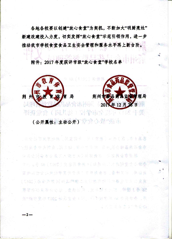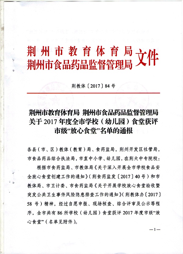 日前,市教体局、市食药监局表彰了2017年度市级"放心食堂",我校食堂荣获此殊荣。