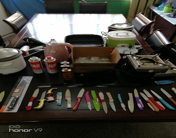 检查发现,少数学生在宿舍内使用违规电器;很多插线板随意摆放在褥子上;一些宿舍室内没人时不锁门。此次检查共没收各类刀具22把、违规电器17件、易燃易爆物品6瓶。
