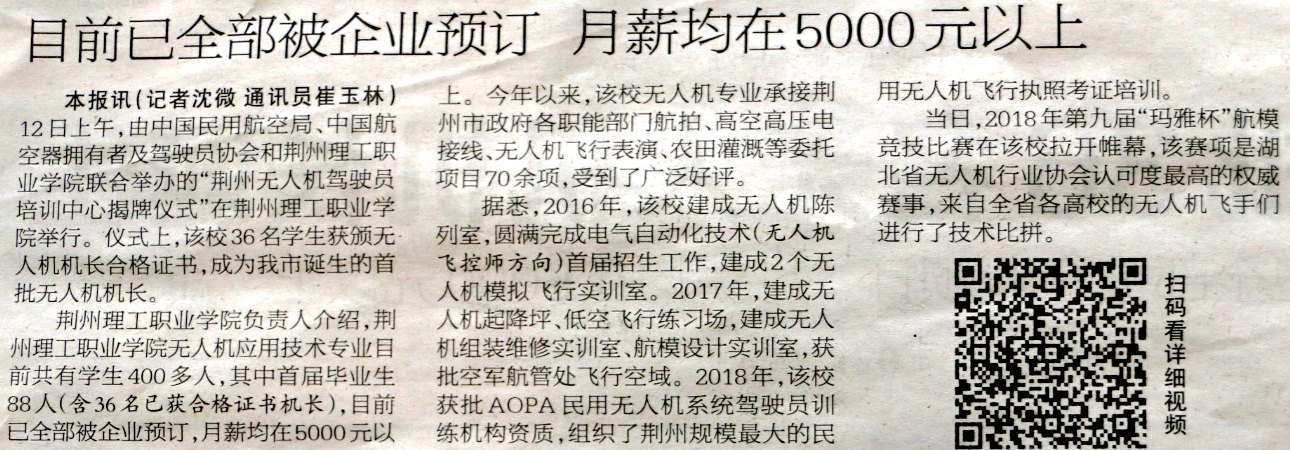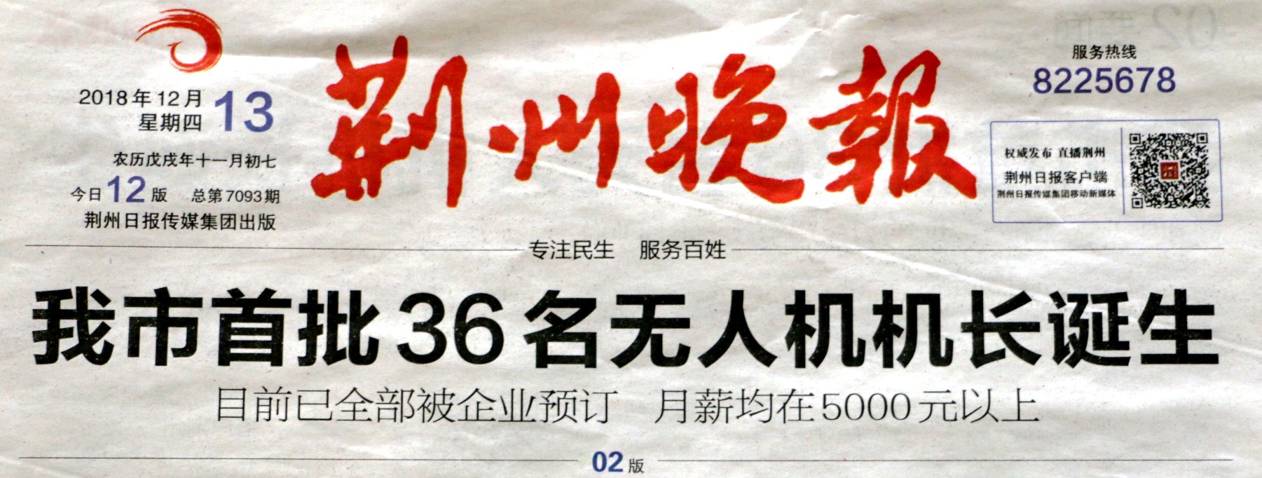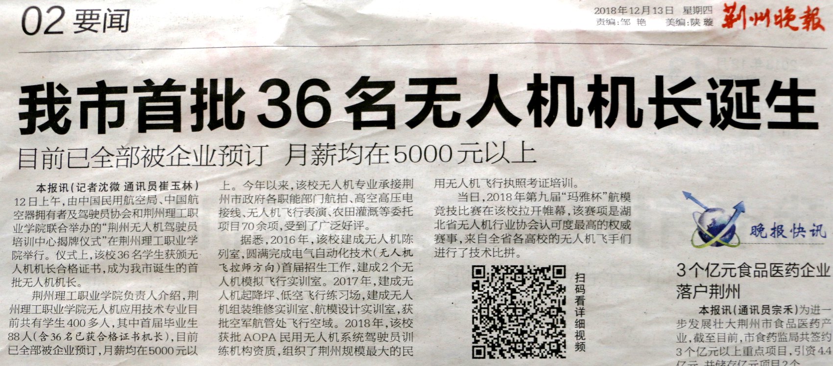 12月12日上午,由我校主办的"荆州无人机驾驶员培训中心揭牌仪式"暨"荆州市首届无人机机长培训结业展演"隆重举行。荆州晚报,2018年12月13日周四,02版,对我校本次活动进行了报道。如下:
