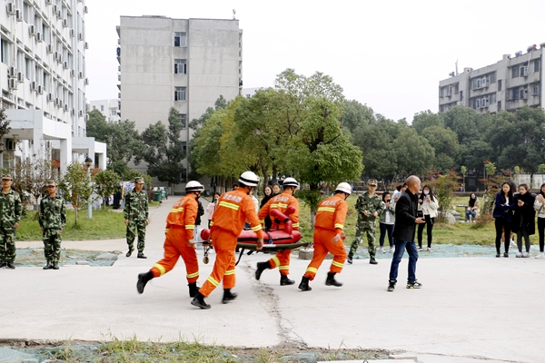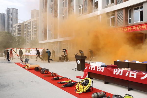 本次活动内容主要包括疏散逃生演练、消防安全知识培训及灭火器模拟灭火演练三个部分。演练开始前,保卫处、学工处及相关部门共同对本次活动进行了周密部署。下午14:40分,演练在沙市区人民政府办公室皮主任的讲话动员中正式拉开帷幕。随着总指挥一声令下,点燃烟雾,警报拉响,参演学生按照应急预案,用湿毛巾捂住口、鼻,迅速从楼梯通道逃出各自宿舍,在七号公寓门前广场排队集合,既定时间内有序撤离模拟火灾现场,没有一人受伤、掉队。随后,现场人员观摩学习了消防员展示的高层公寓内救援逃生。