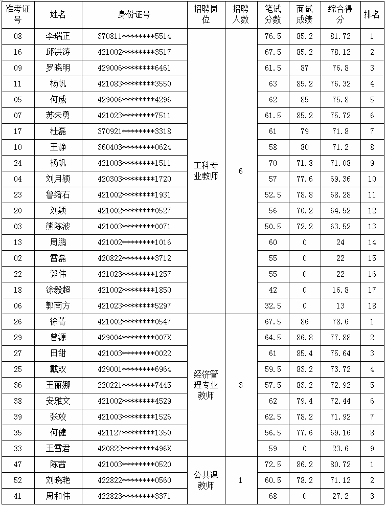 荆州理工职业学院关于2018年度公开招聘工作人员综合成绩和体检考核入围人员名单公示