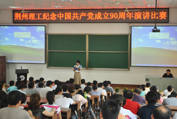 6月 23日下午3时,为庆祝中国共产党成立 90周年,一场主题为"忠诚和奉献"的全院教职工演讲比赛在学院阶梯教室举行。院领导王海棠、童应学、龚恒、黄永平、王克军出席演讲比赛。